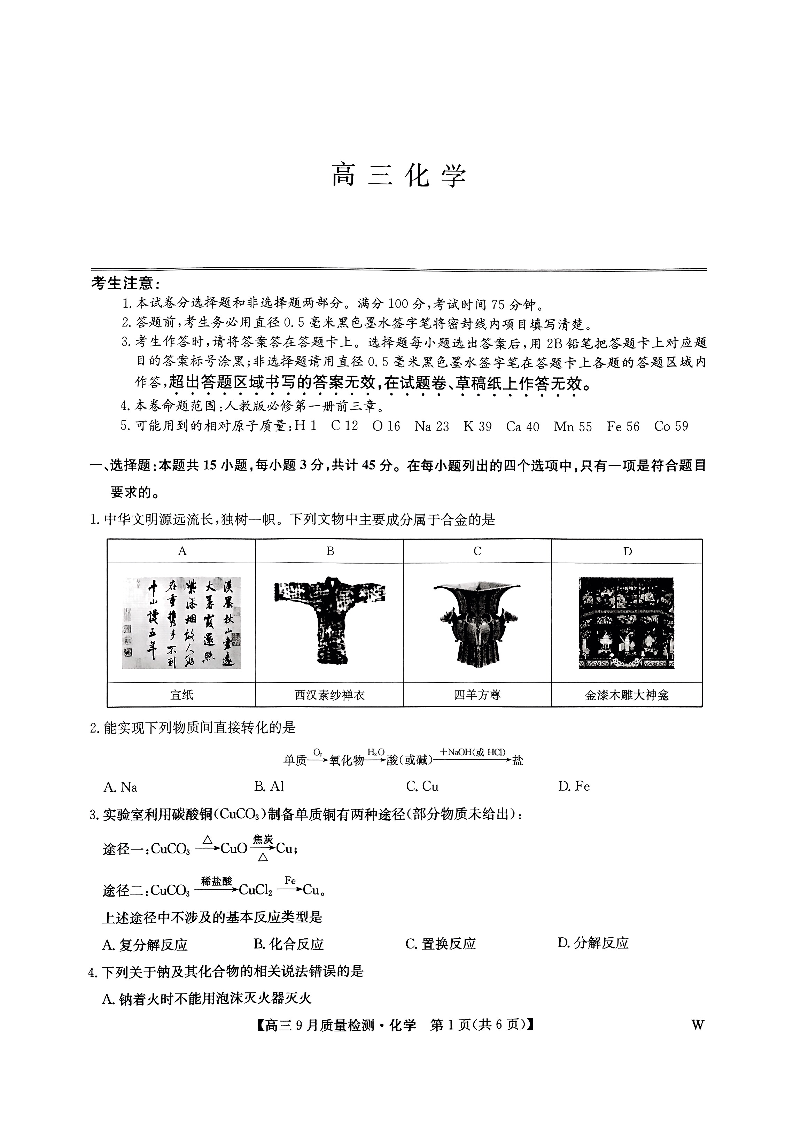 江西省九师联盟2025届高三年级上学期9月联考化学
