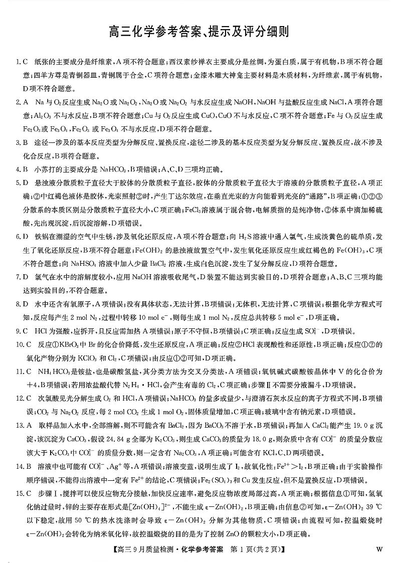 江西省九师联盟2025届高三年级上学期9月联考化学答案