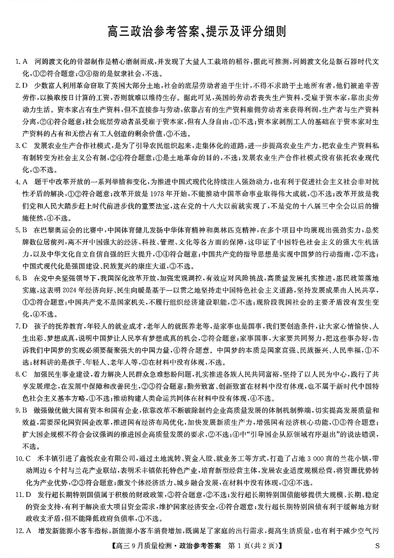 江西省九师联盟2025届高三年级上学期9月联考政治答案