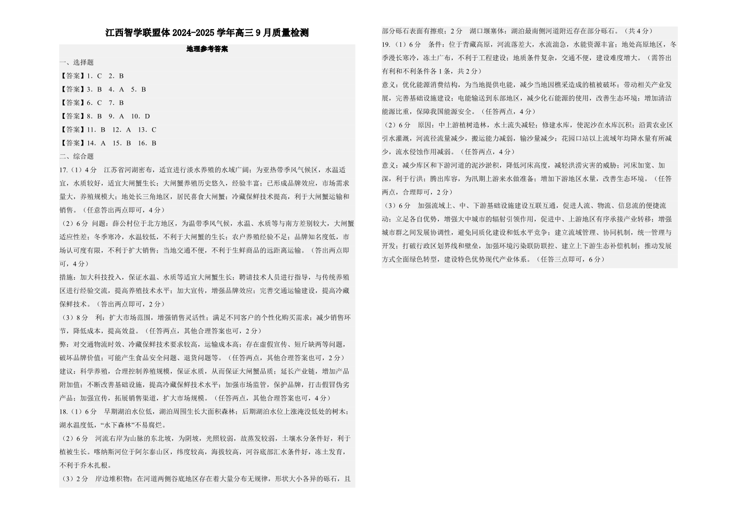 江西智学联盟体2024-2025学年高三9月质量检测 地理答案