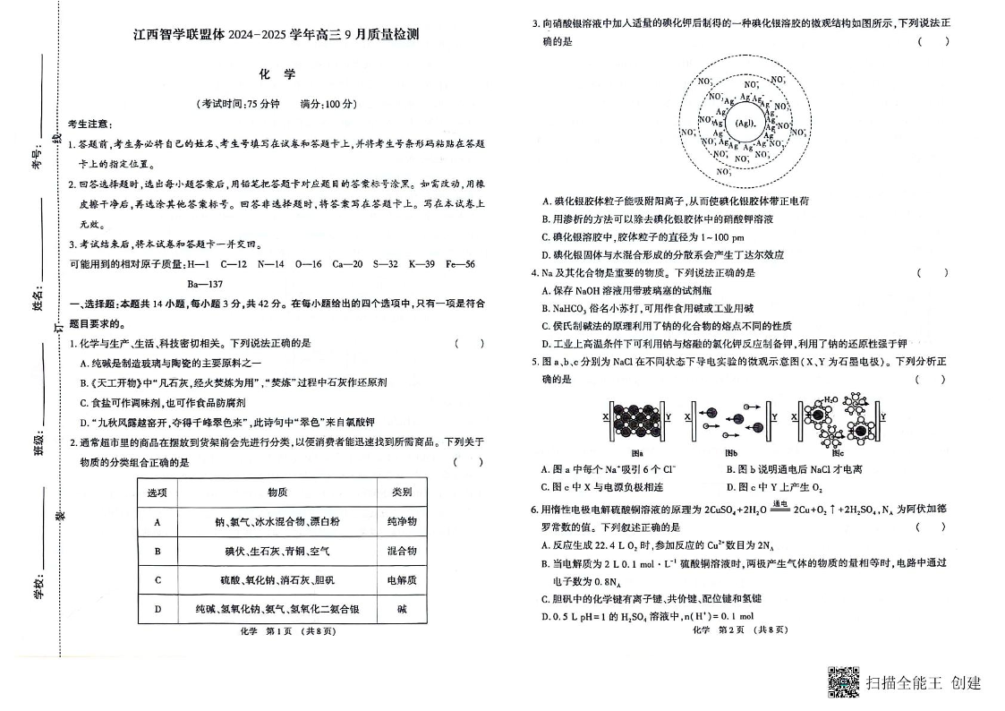 江西智学联盟体2024-2025学年高三9月质量检测 化学试卷