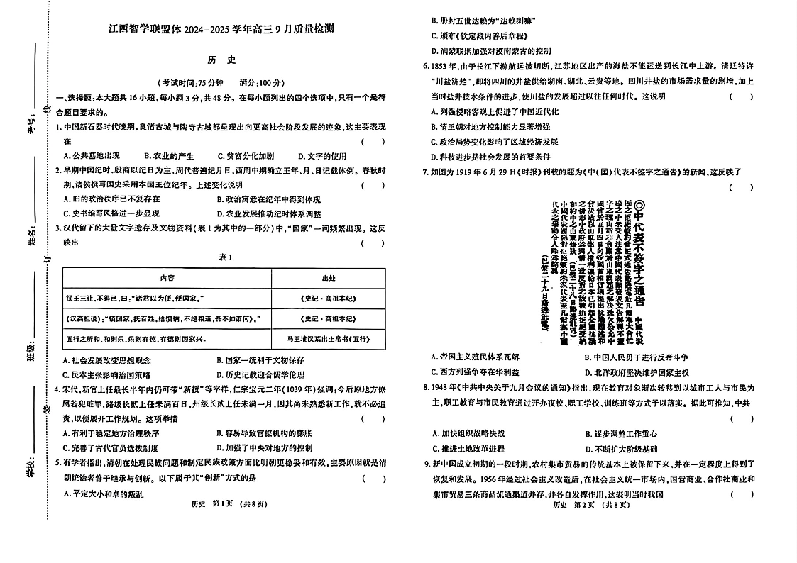 江西智学联盟体2024-2025学年高三9月质量检测 历史试卷