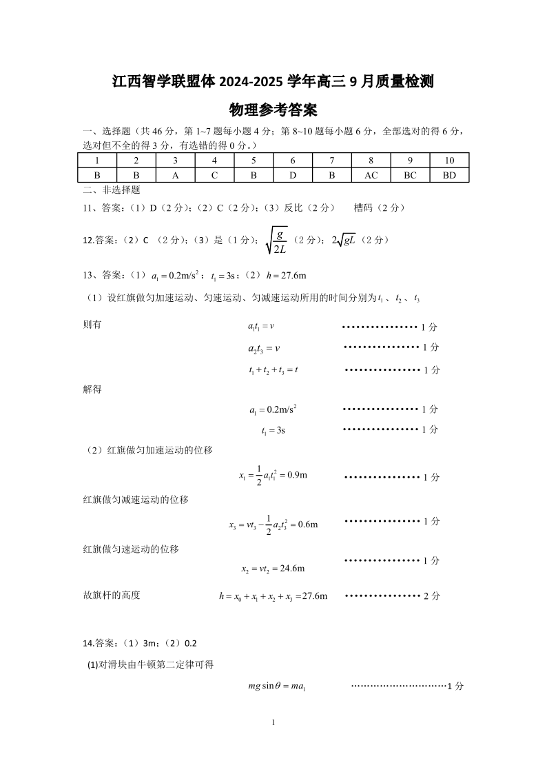 江西智学联盟体2024-2025学年高三9月质量检测 物理答案