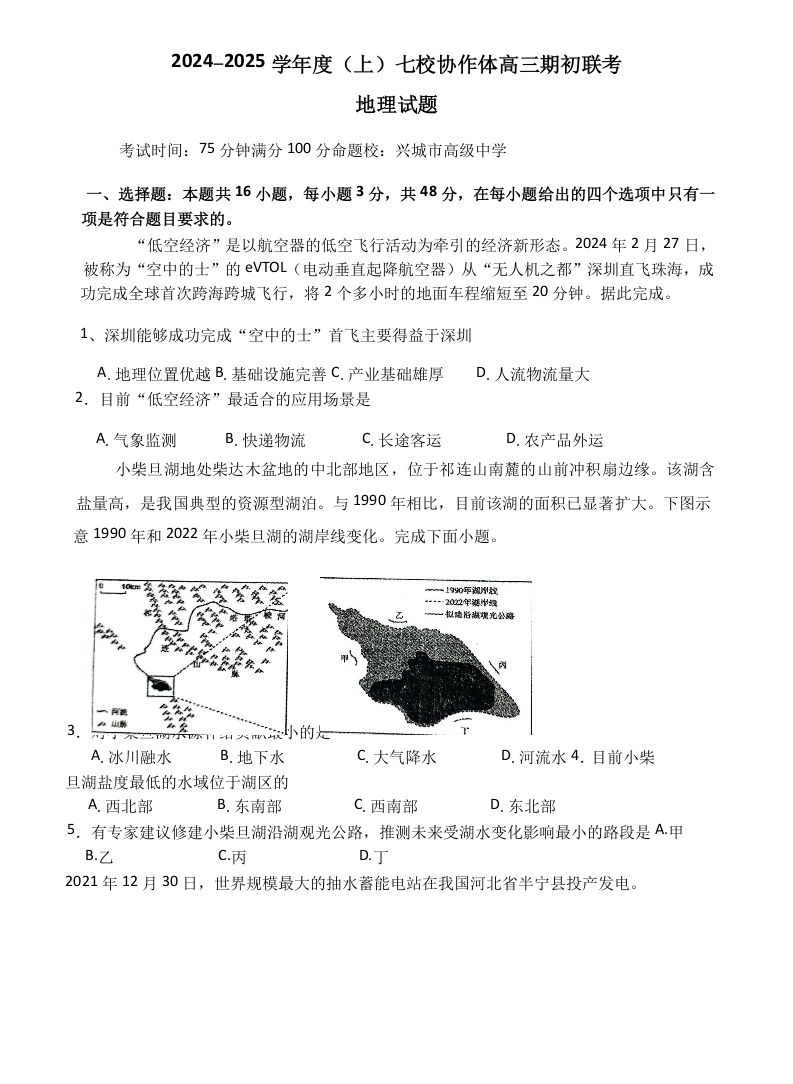辽宁省2024-2025学年度(上)七校协作体高三期初联考地理