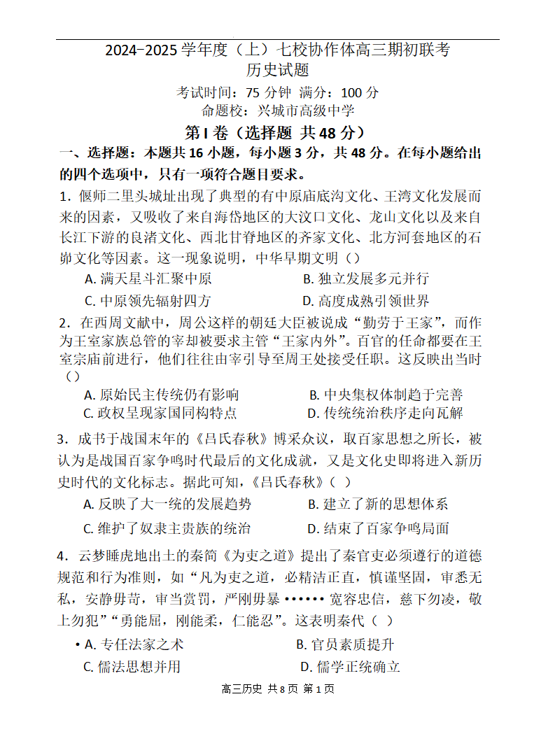 辽宁省2024-2025学年度(上)七校协作体高三期初联考历史+答案
