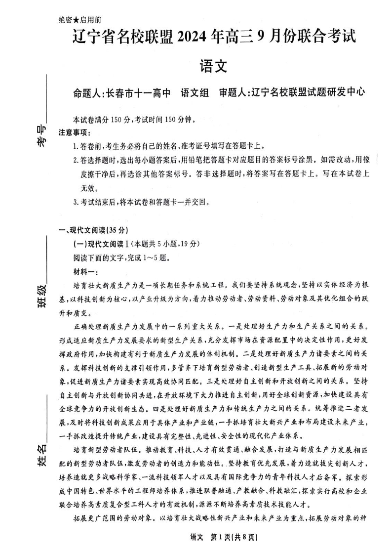 辽宁省名校联盟2024年高三9月份联合考试语文