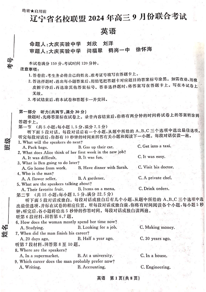 辽宁省名校联盟2024年高三9月份联合考试英语