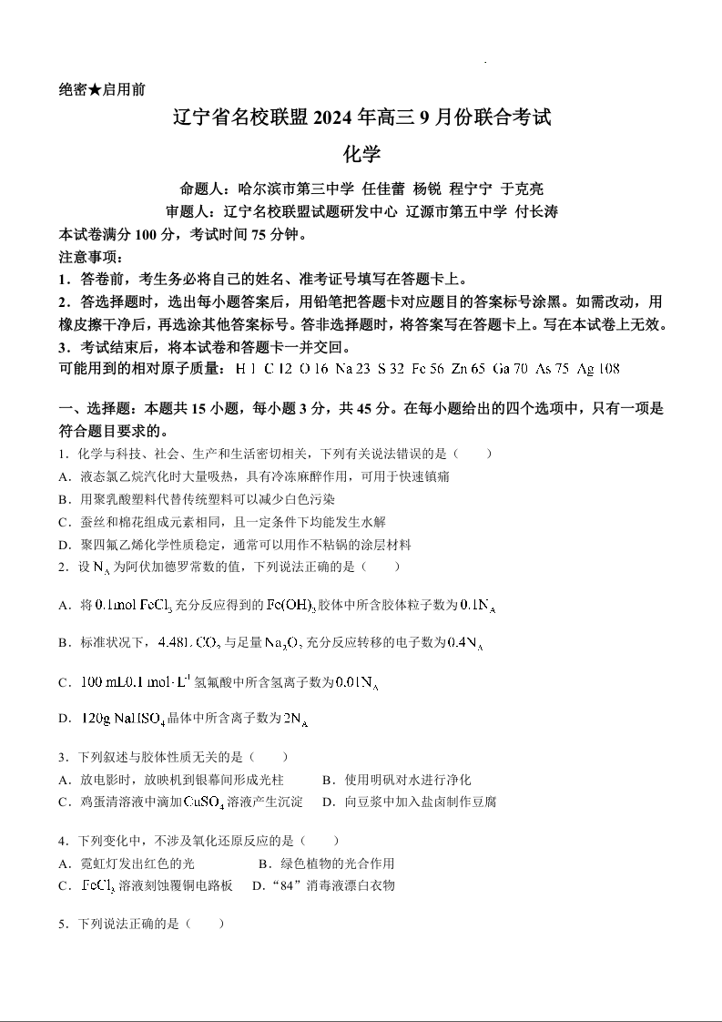 辽宁省名校联盟2024年高三9月份联合考试化学