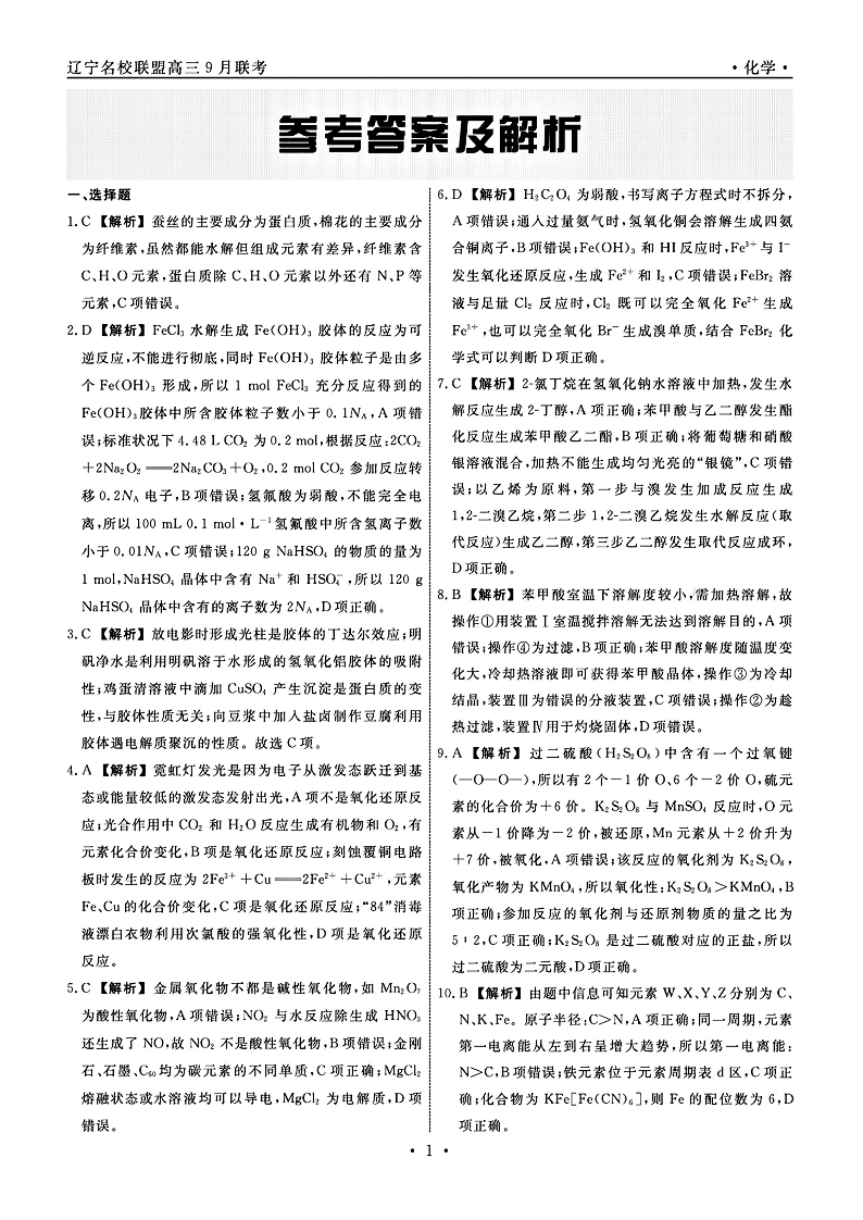辽宁省名校联盟2024年高三9月份联合考试化学答案