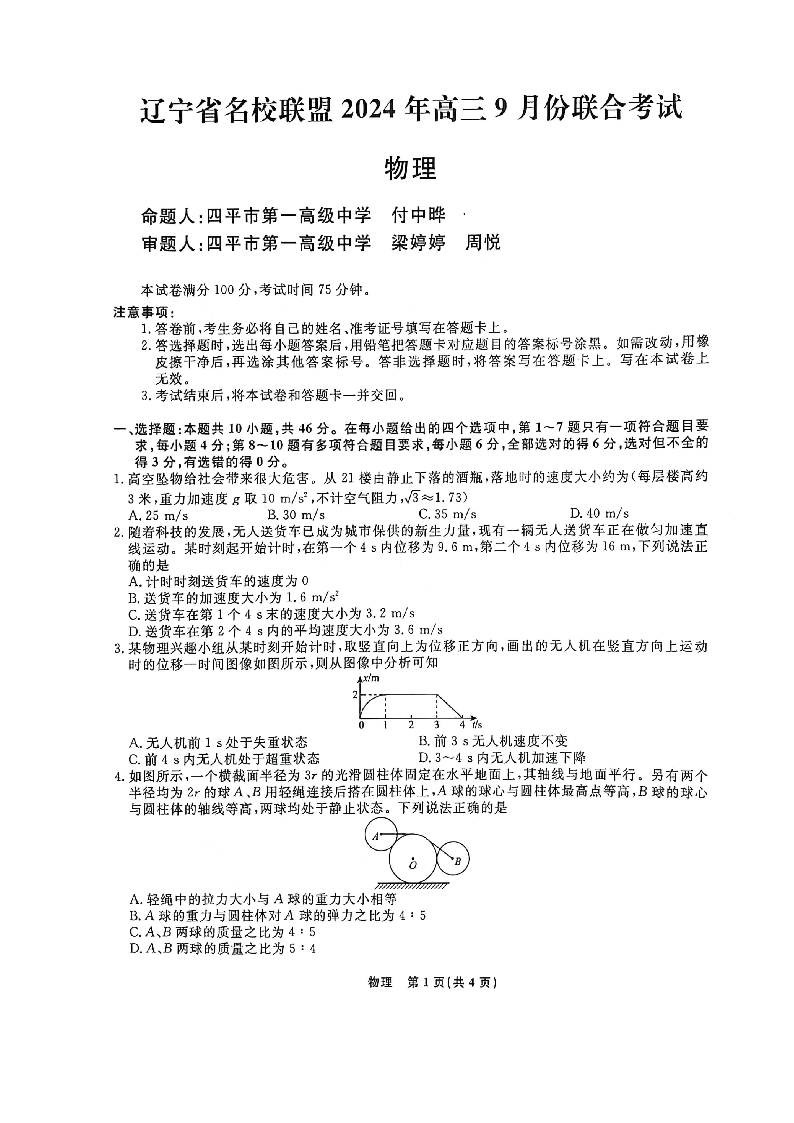 辽宁省名校联盟2024年高三9月份联合考试物理