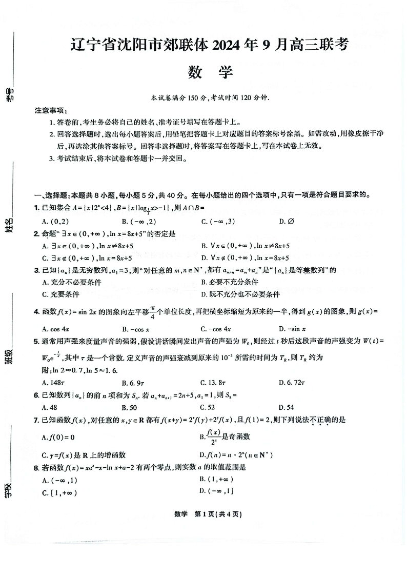 辽宁省沈阳市郊联体2024年9月高三联考数学+答案