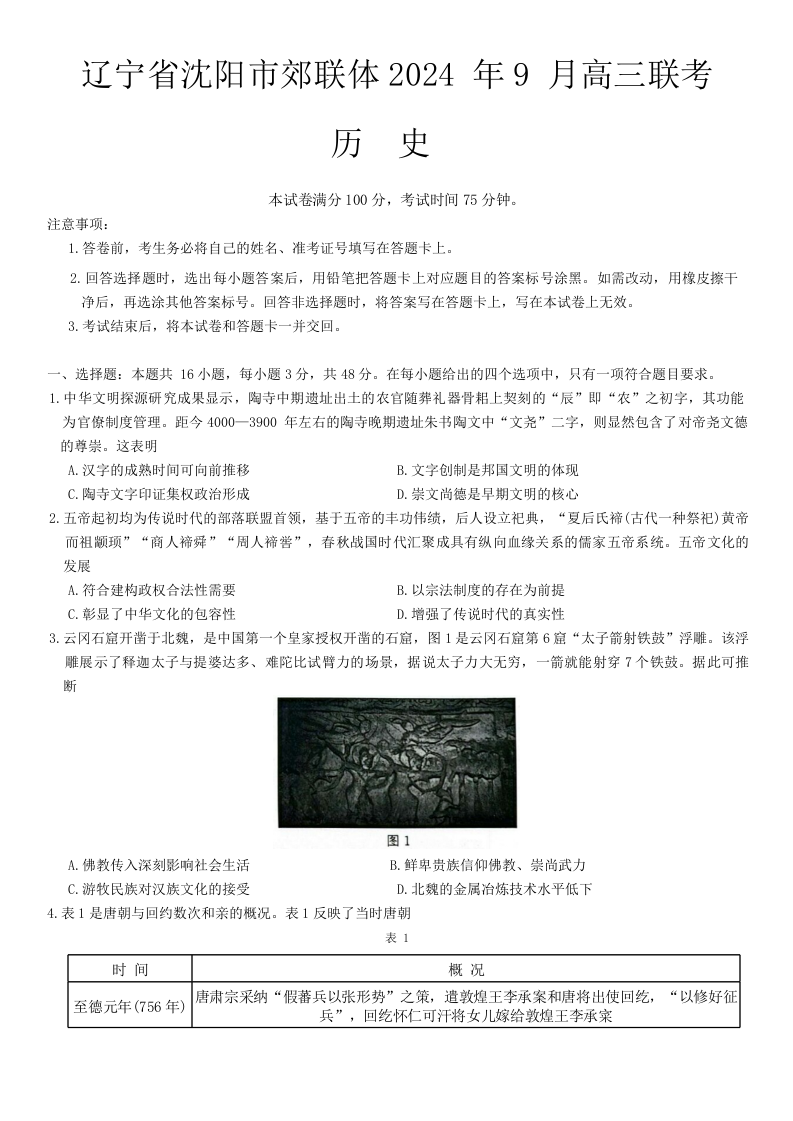 辽宁省沈阳市郊联体2024年9月高三联考历史+答案
