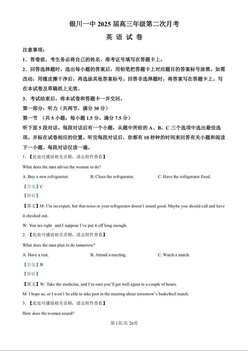 宁夏银川一中2025届高三上学期第二次月考英语试卷(解析版)