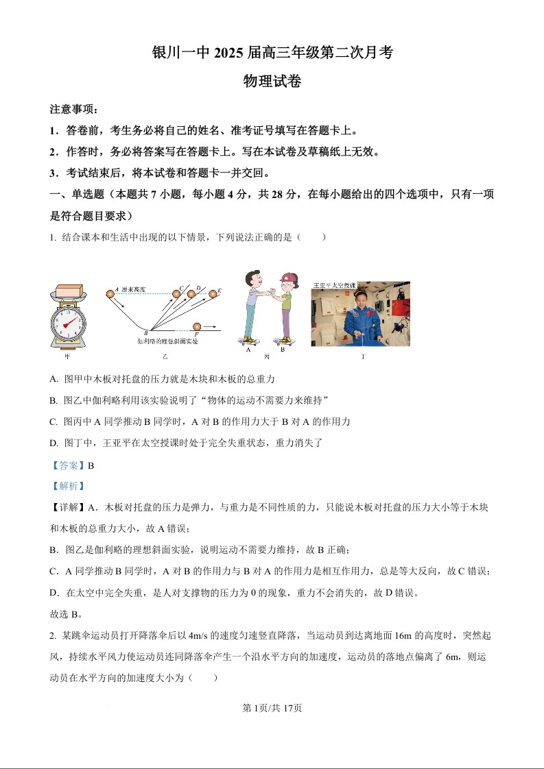 宁夏银川一中2025届高三上学期第二次月考物理试卷(解析版)