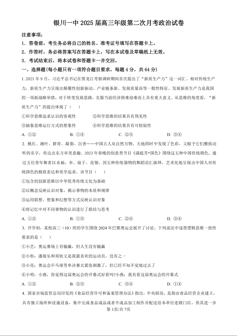宁夏银川一中2025届高三上学期第二次月考政治试题(原卷版)