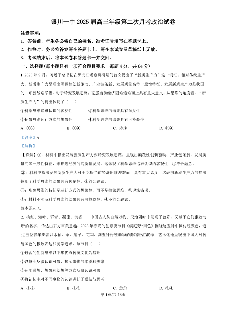 宁夏银川一中2025届高三上学期第二次月考政治试题(解析版)