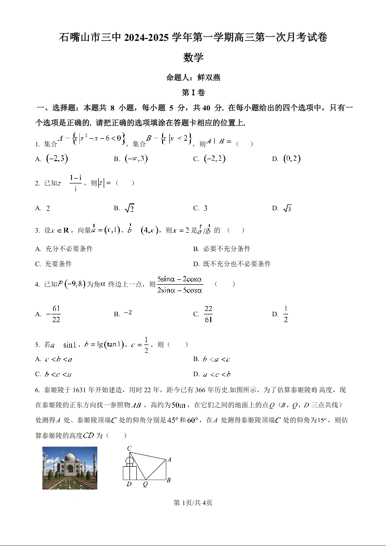 宁夏回族自治区石嘴山市第三中学2024-2025学年第一学期高三第一次月考试卷数学试题(原卷版)