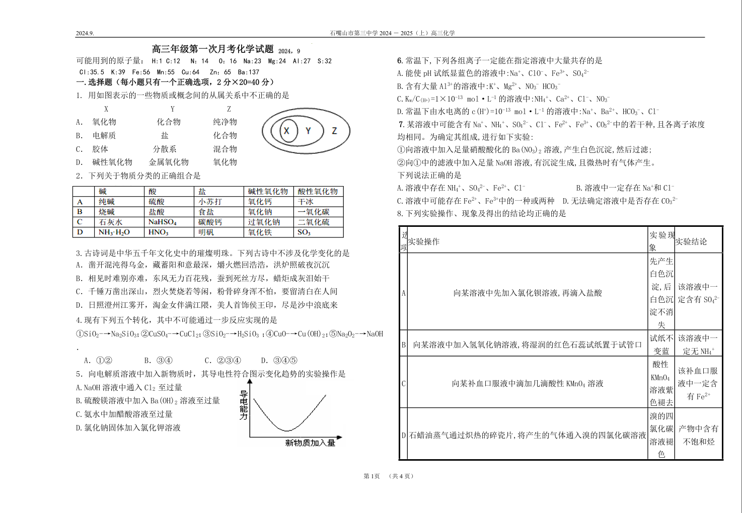 宁夏回族自治区石嘴山市第三中学2024-2025学年第一学期高三第一次月考试卷化学