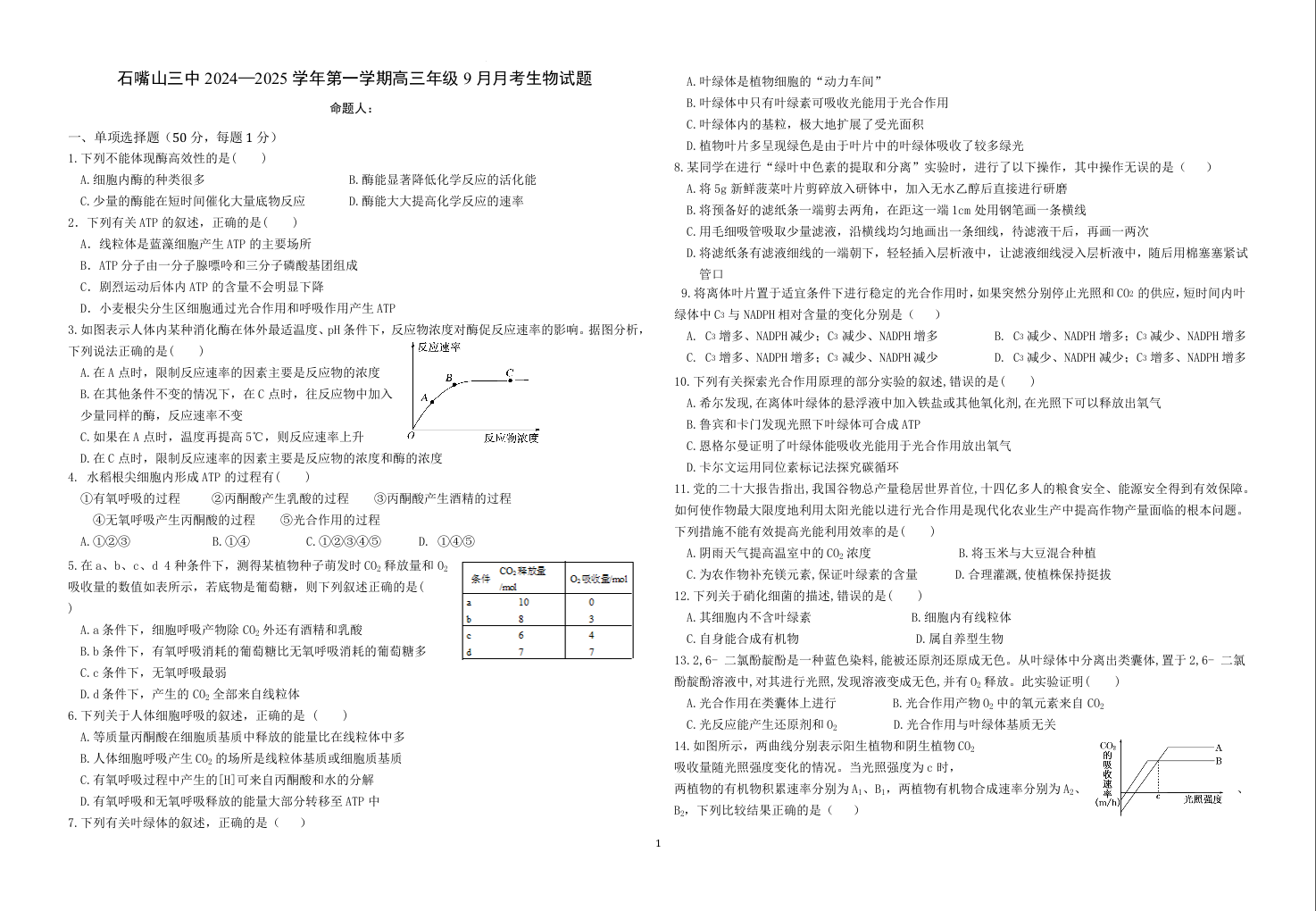 宁夏回族自治区石嘴山市第三中学2024-2025学年第一学期高三第一次月考试卷生物
