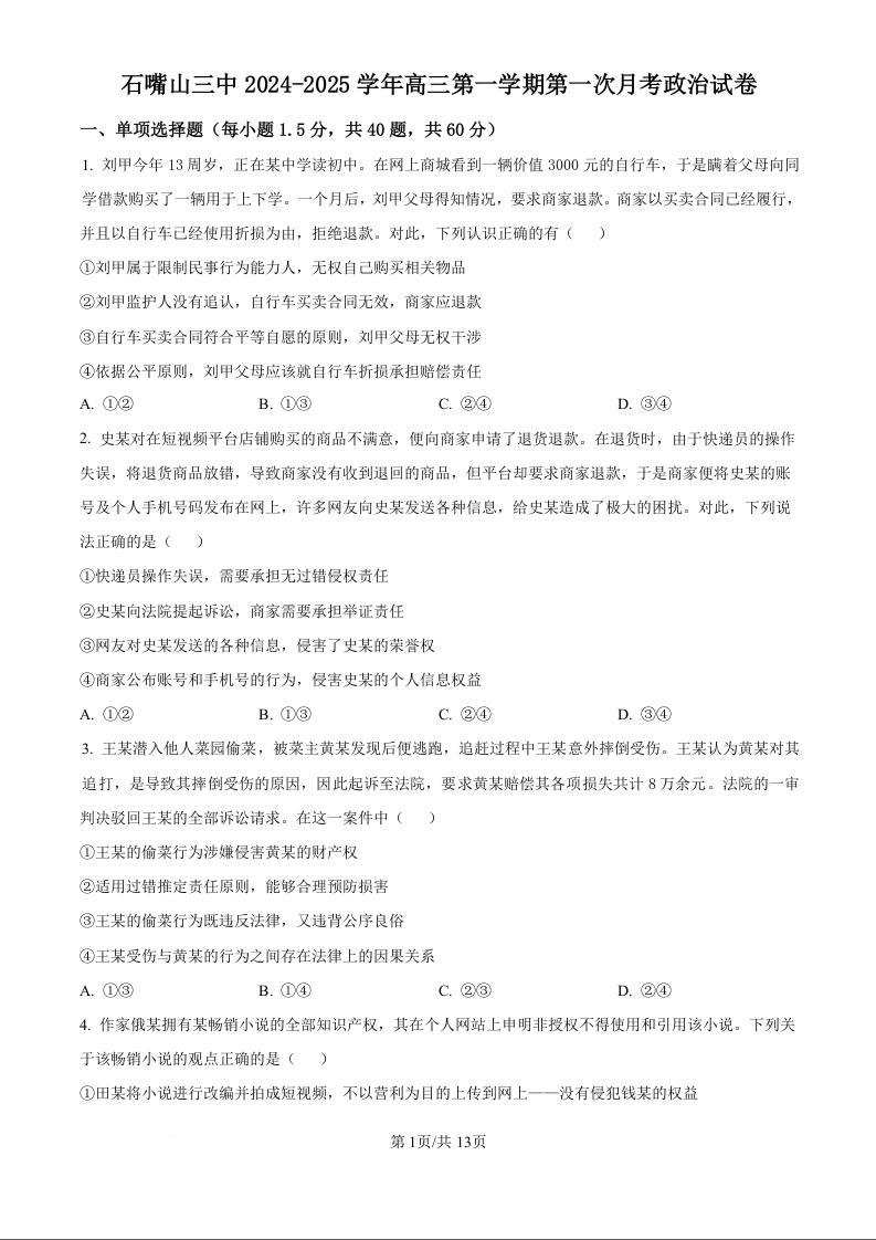 宁夏回族自治区石嘴山市第三中学2024-2025学年第一学期高三第一次月考试卷政治试题(原卷版)