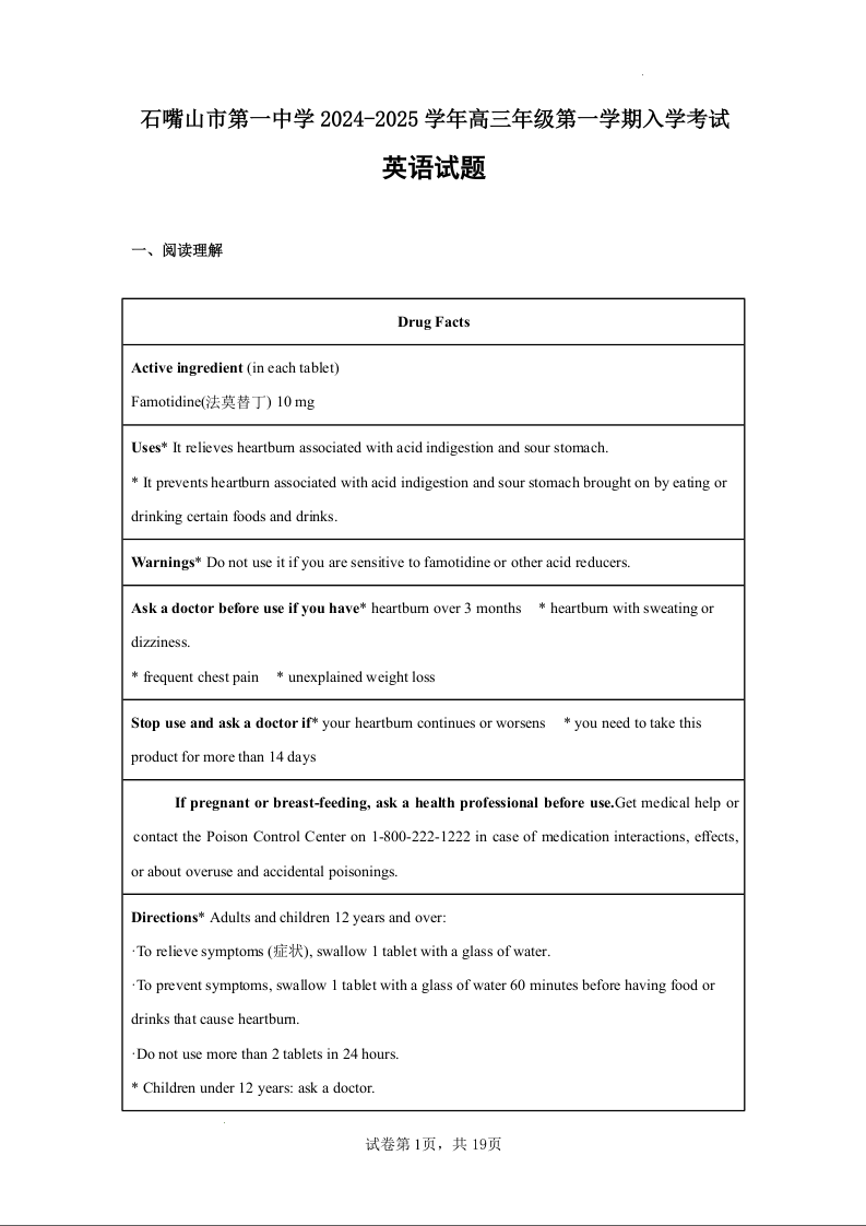 宁夏回族自治区石嘴山市第一中学2024-2025学年度高三年级开学测试英语答案
