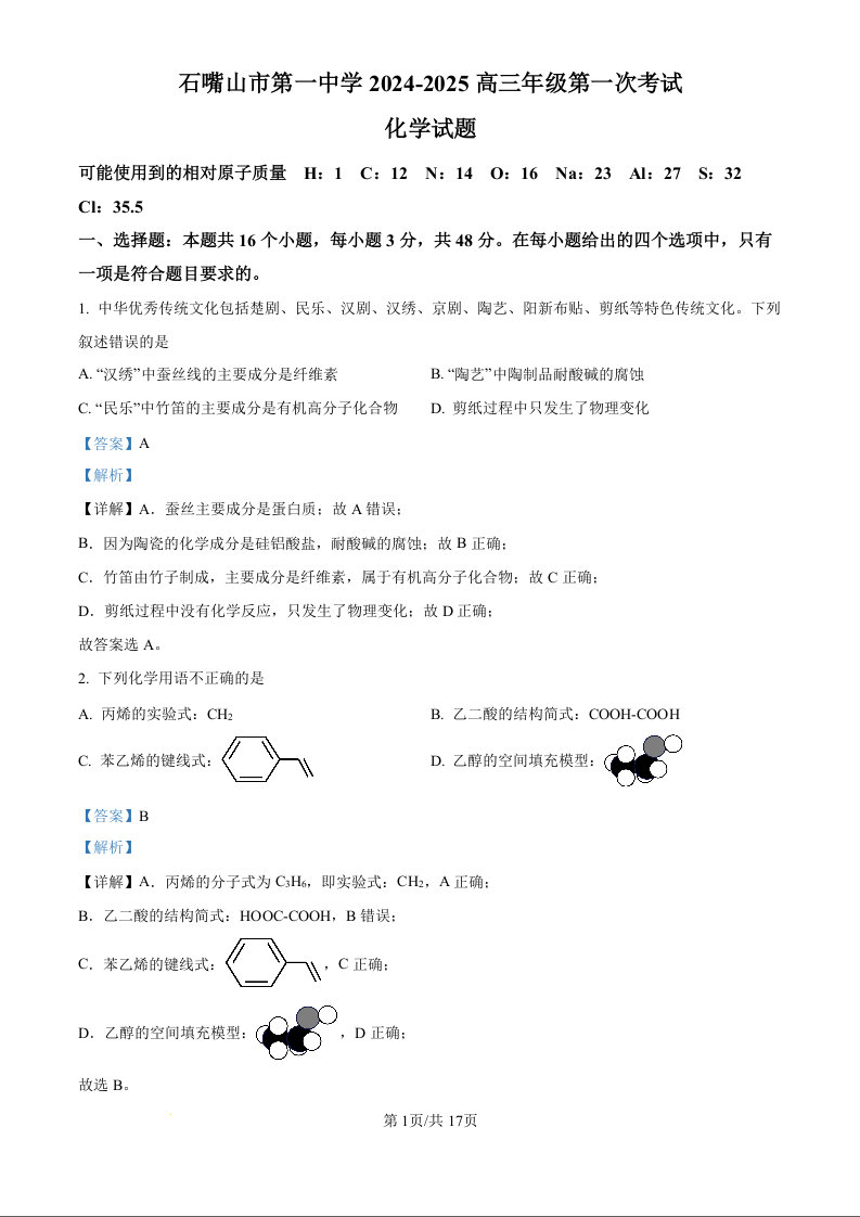 宁夏回族自治区石嘴山市第一中学2024-2025学年度高三年级开学测试化学试题(解析版)
