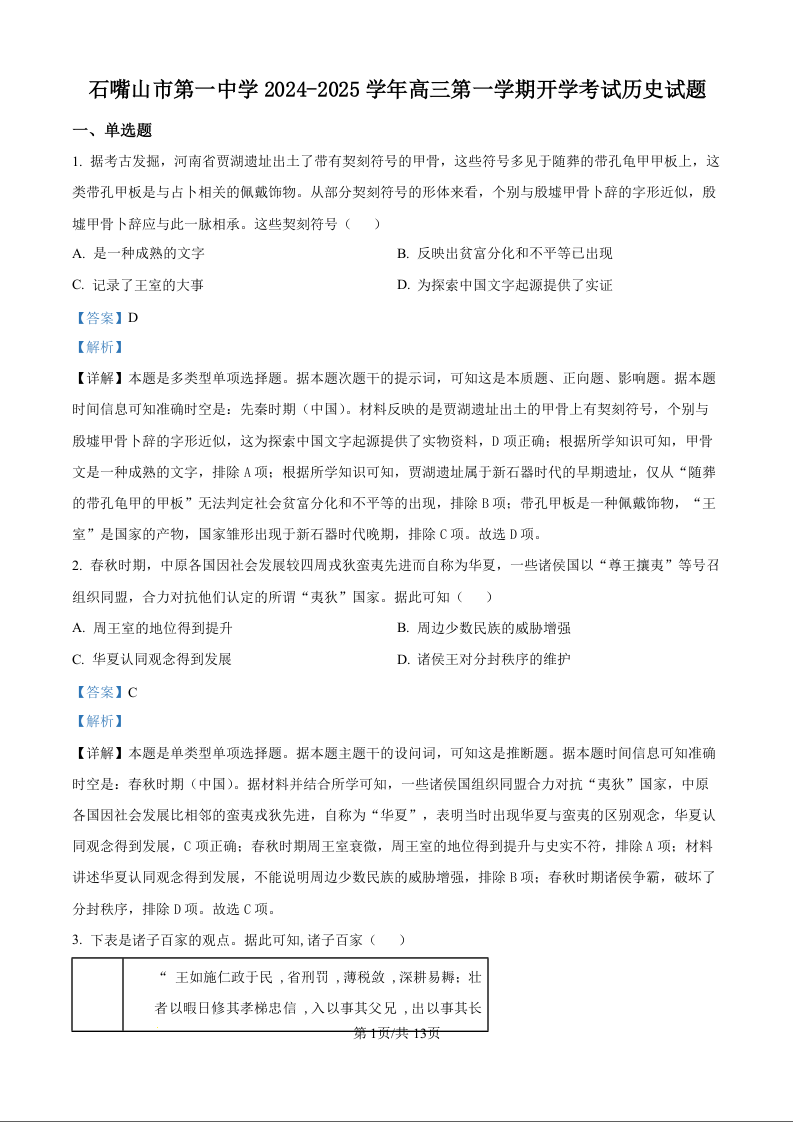宁夏回族自治区石嘴山市第一中学2024-2025学年度高三年级开学测试历史试题(解析版)