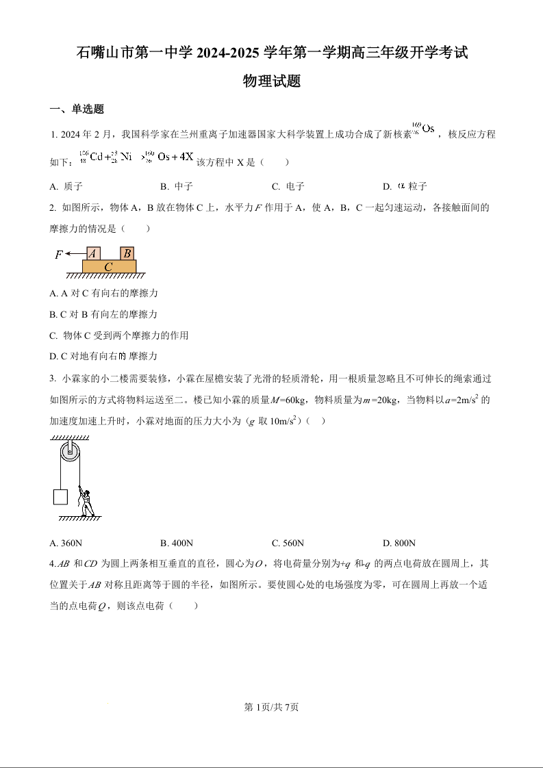 宁夏回族自治区石嘴山市第一中学2024-2025学年度高三年级开学测试物理试题(原卷版)