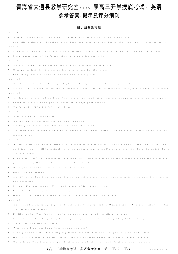 青海省西宁市大通县教学研究室2025届高三开学摸底考试英语答案