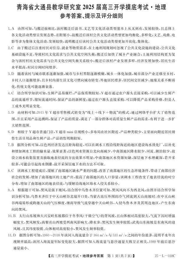 青海省西宁市大通县教学研究室2025届高三开学摸底考试地理答案
