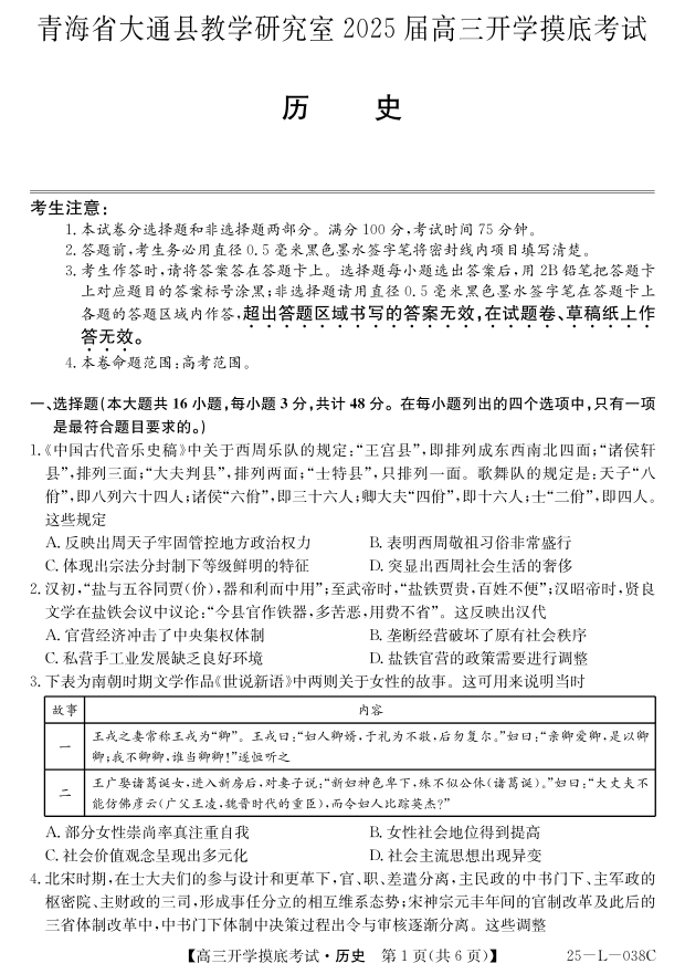 青海省西宁市大通县教学研究室2025届高三开学摸底考试历史