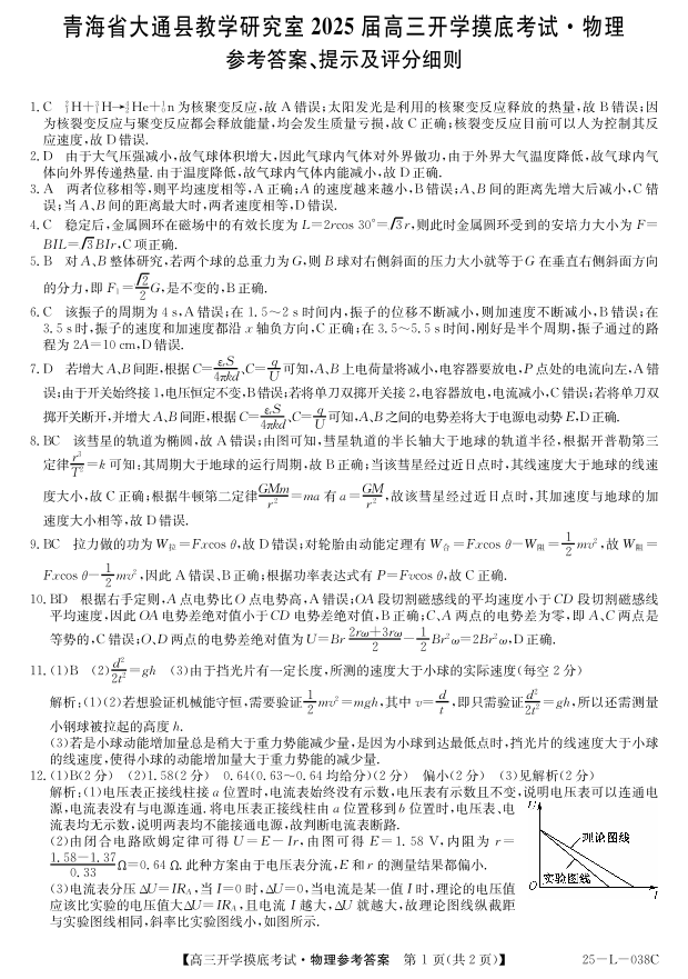 青海省西宁市大通县教学研究室2025届高三开学摸底考试物理答案