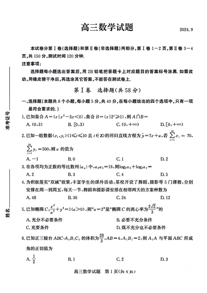 山东省德州市2025届高三上学期9月开学考试数学试题+答案