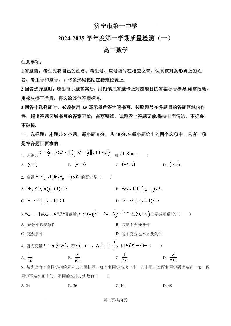山东省济宁市第一中学2024-2025学年度第一学期质量检测(一)数学试题(原卷版)