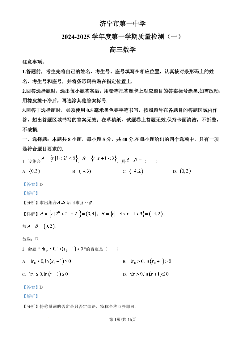 山东省济宁市第一中学2024-2025学年度第一学期质量检测(一)数学试题(解析版)