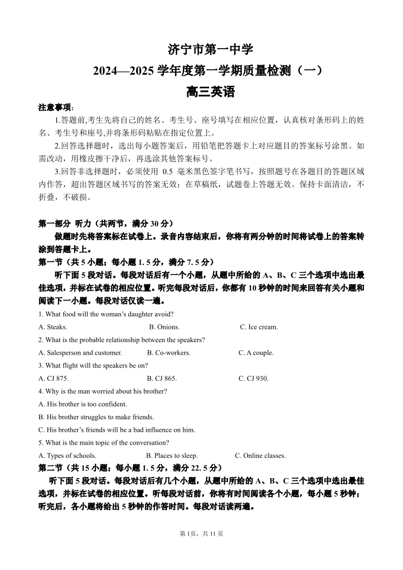 山东省济宁市第一中学2024-2025学年度第一学期质量检测(一)英语