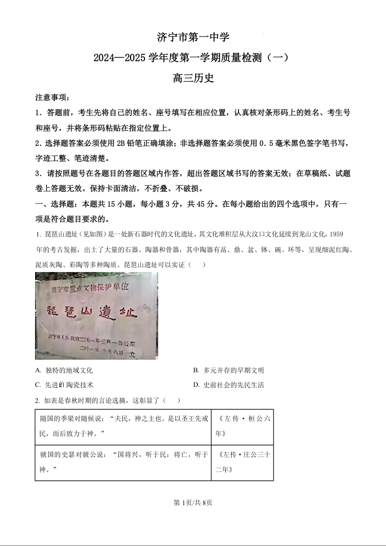 山东省济宁市第一中学2024-2025学年度第一学期质量检测(一)历史试题(原卷版)