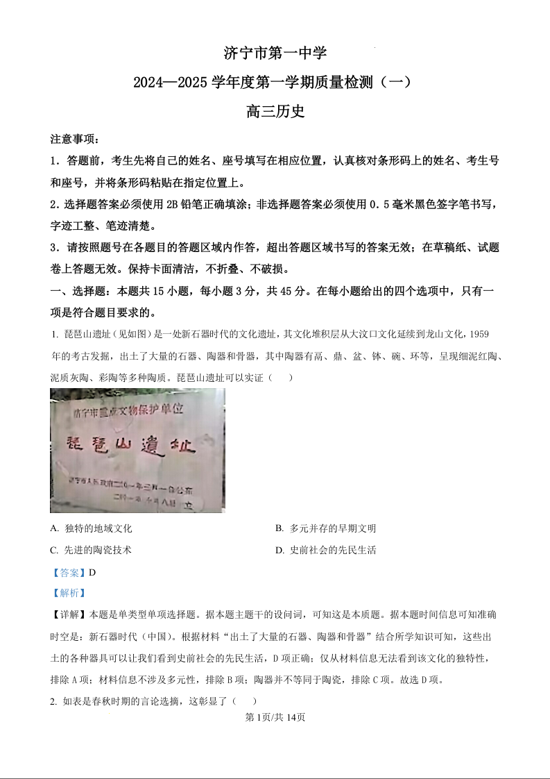 山东省济宁市第一中学2024-2025学年度第一学期质量检测(一)历史试题(解析版)