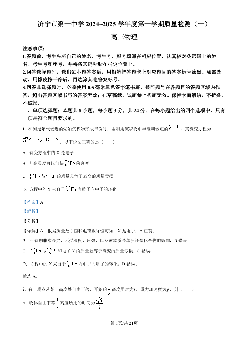 山东省济宁市第一中学2024-2025学年度第一学期质量检测(一)物理试题(解析版)