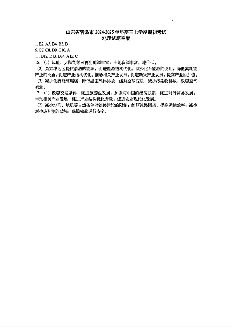 山东省青岛市2024年高三年级期初调研检测地理答案