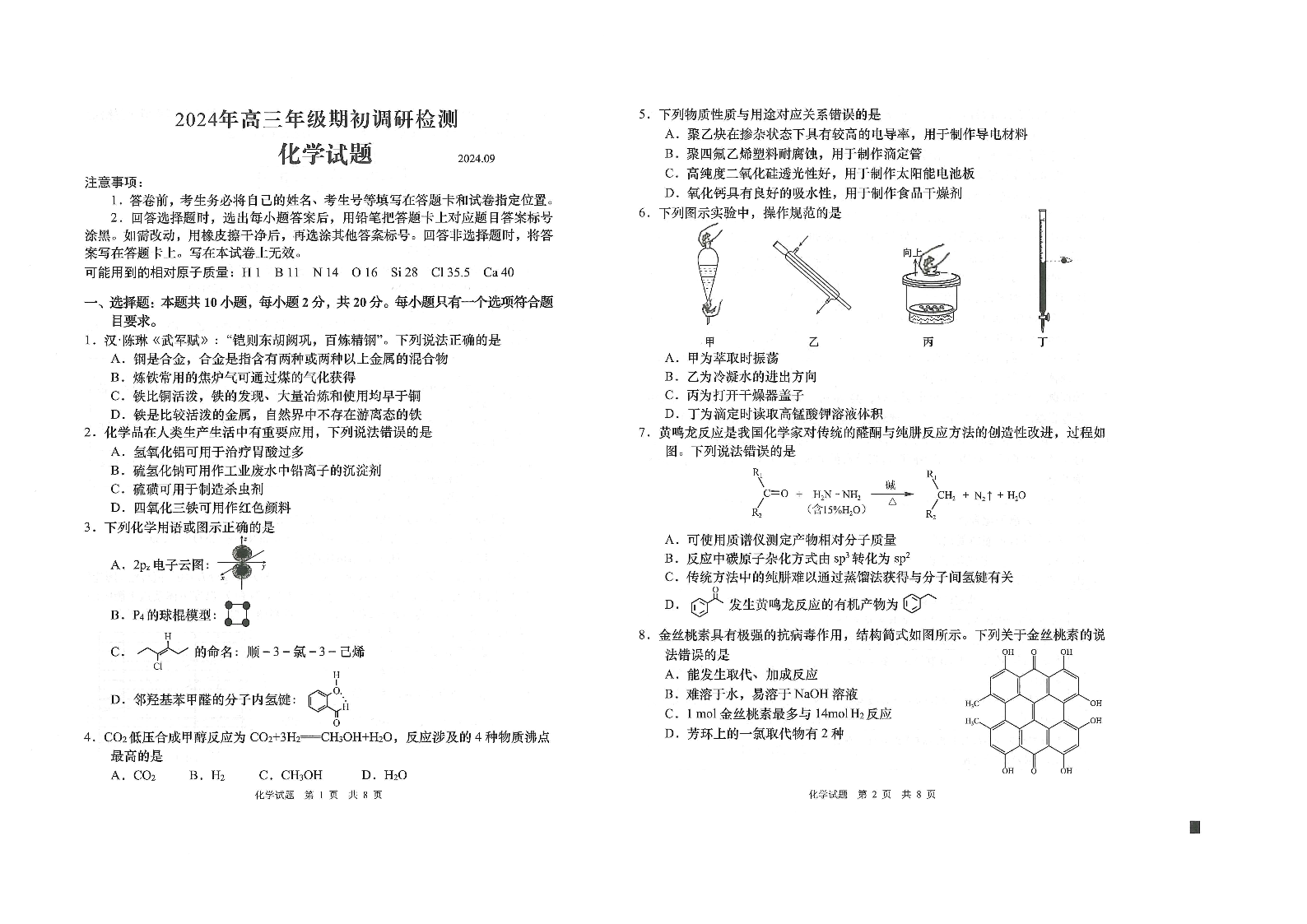 山东省青岛市2024年高三年级期初调研检测化学试卷