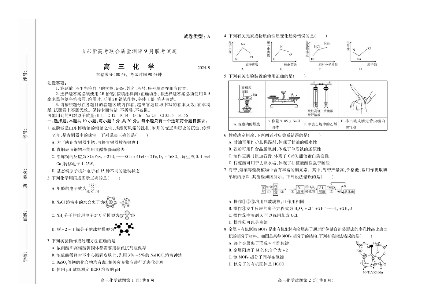 山东省新高考联合质量测评2025届9月联考试题化学