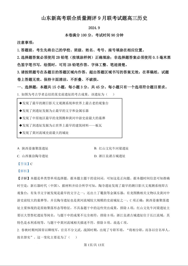 山东省新高考联合质量测评2025届9月联考试题历史试题(解析版)