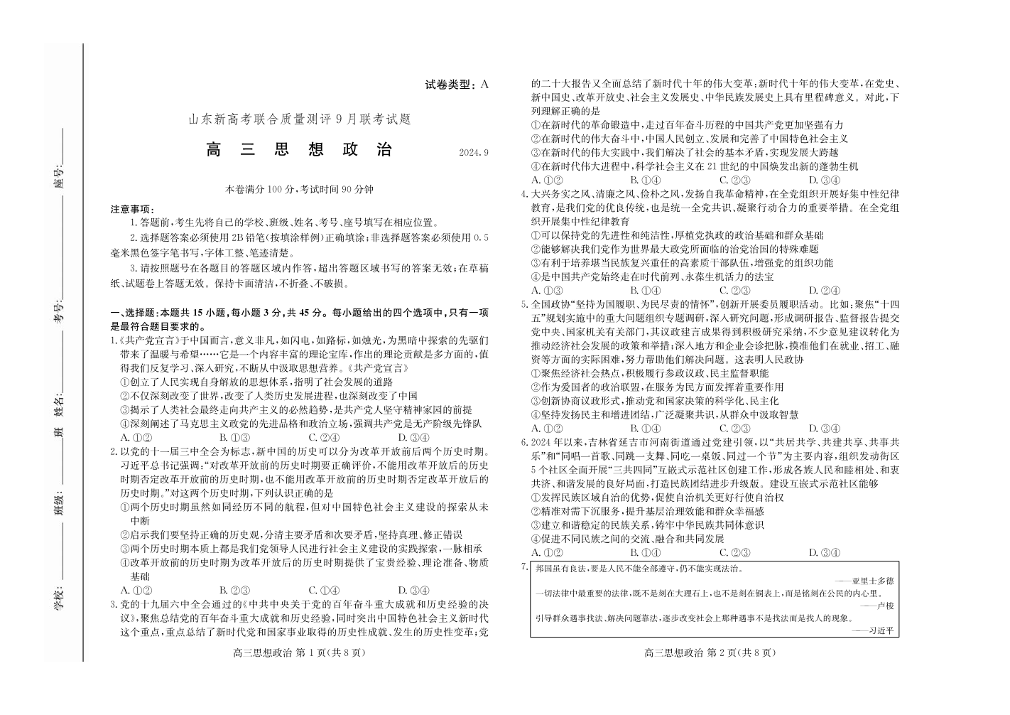 山东省新高考联合质量测评2025届9月联考试题政治