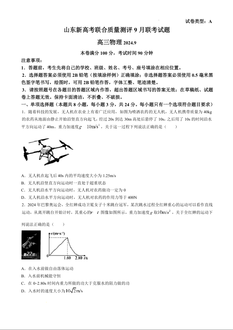 山东省新高考联合质量测评2025届9月联考试题物理