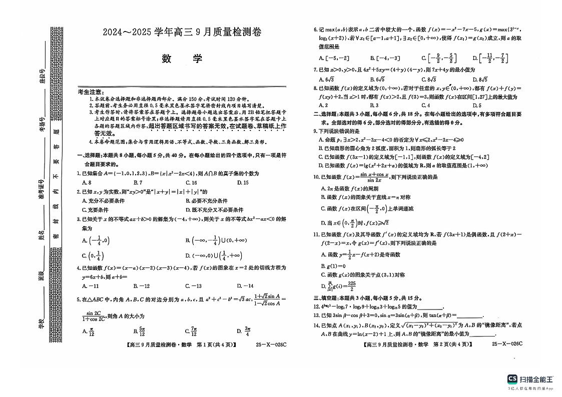 山西省部分高中2024-2025学年高三9月质量检测卷数学
