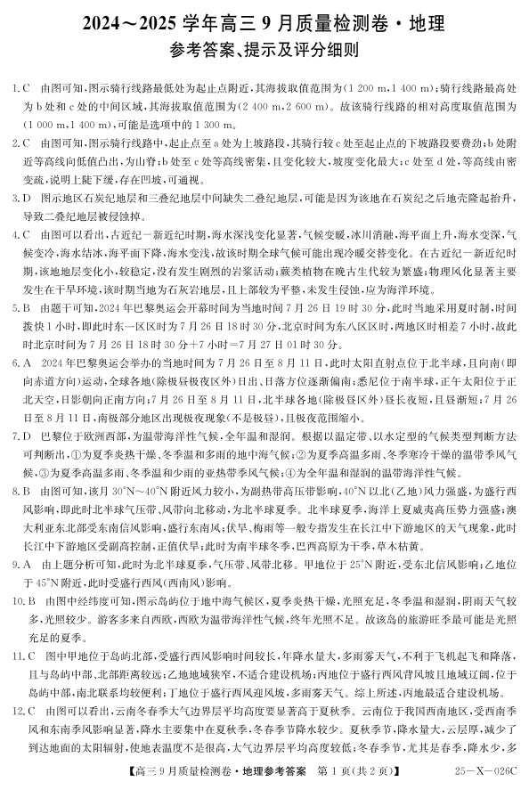 山西省部分高中2024-2025学年高三9月质量检测卷地理答案