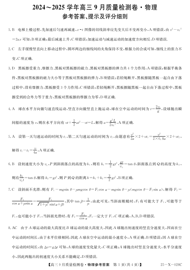 山西省部分高中2024-2025学年高三9月质量检测卷物理答案