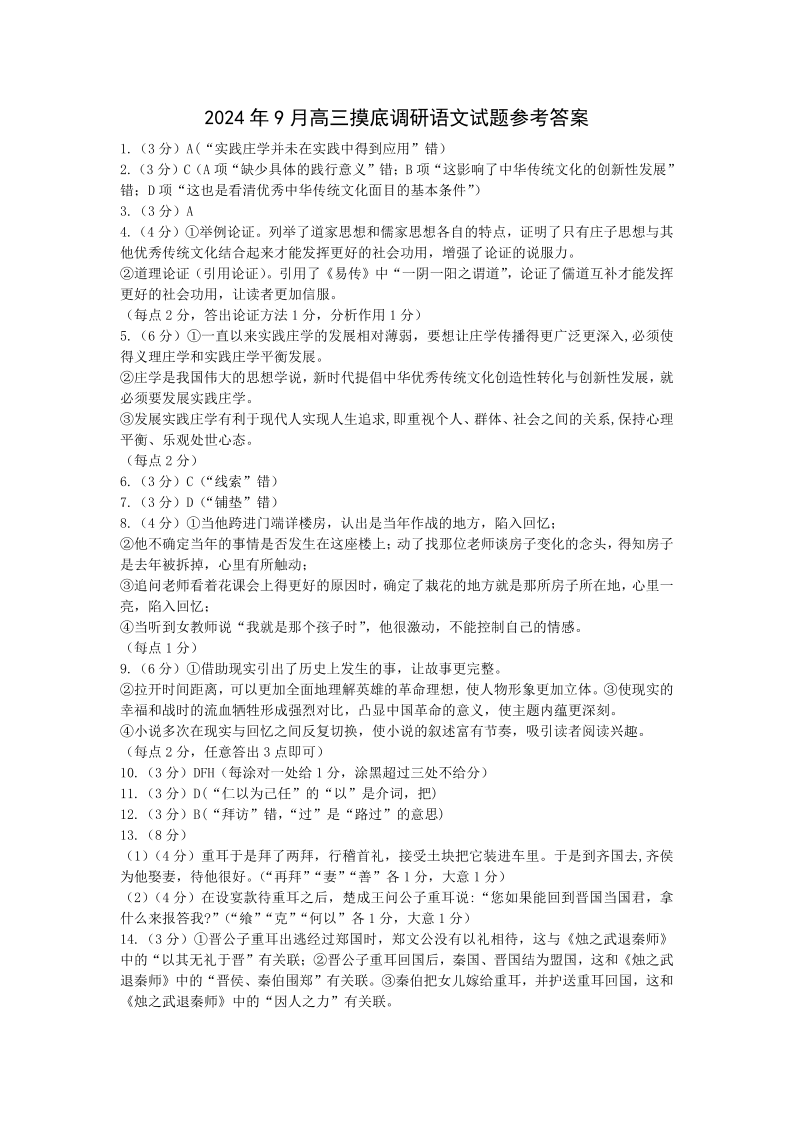 山西省运城市2024-2025学年高三摸底调研测试语文答案
