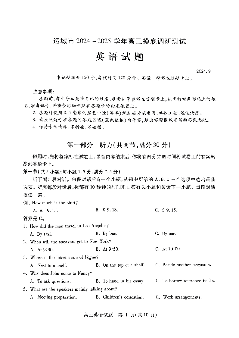 山西省运城市2024-2025学年高三摸底调研测试英语